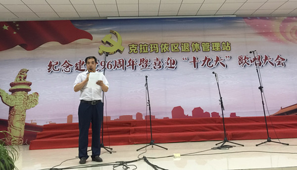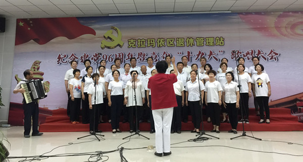 6月29日下午,克拉玛依区退休管理站在建党96周年来临,组织区属退休人员近二百人激情开唱,喜迎“十九大”。虽然表演者都是退休人员,唱功远不及专业歌星,但他们的演唱热情却感染着全场退休人员。在《没有共产党就没有新中国》、《唱支山歌给党听》等一首首红歌令一阵阵热情的掌声从活动现场里传出。