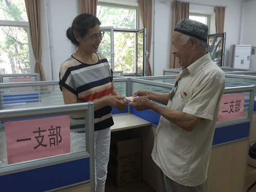 7月10日下午,市委老干部局第一党支部党员玉山音·艾山郑重地将他今年获得市级优秀党员的1000元奖金,作为一次性党费上交给第一党支部副书记杨丽,他说:“我是党培养的,我的一切都是属于党的。”