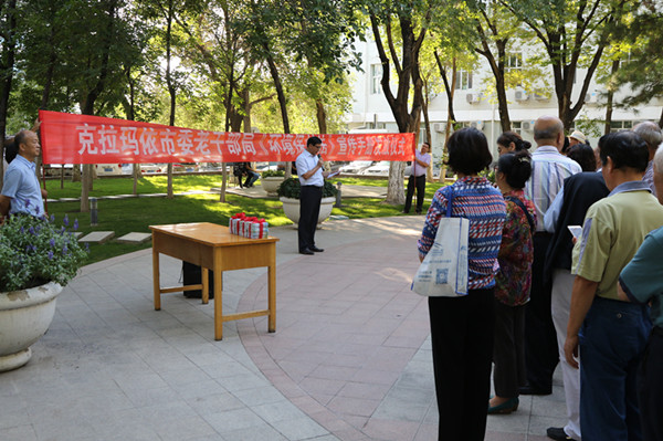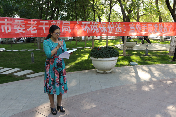 8月29日,市委老干部局在市机关退休站门前小广场举行新《环境保护法》环保宣传手册发放仪式,市委组织部副部长、老干部局局长木塔力甫·克力木,市委老干部局副局长陶胜利以及300余名退休职工参加了发放仪式。