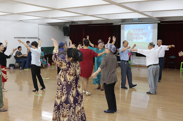 活动在愉快的趣味游戏中拉开帷幕,接力运乒乓球、齐心协力踩气球等欢快的小游戏瞬间带动了现场的气氛,大家脸上笑容洋溢,欢呼声不断。结对亲人们组队合作完成趣味游戏,在娱乐中增进感情,拉近距离;在合作中促进交流,互帮互助。活动接近尾声,欢快的麦西莱普音乐将活动推向高潮,结对亲人们不约而同走到场地中间,迈起轻快的步伐,扬起轻柔的手臂,载歌载舞,好不热闹,现场氛围一派祥和。