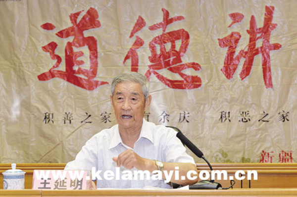 8月17日,克拉玛依市首届道德模范王延明应邀登上克拉玛依日报社的“道德讲堂”。今年85岁的王延明,因病主动从领导的岗位上退下来后,一直带领家属们搞绿化,让采油二厂改变了荒滩的模样,变成了“小江南”。