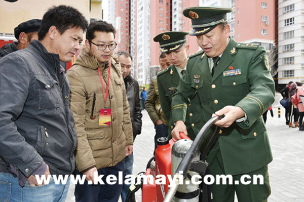 11月5日,市区油建北小区内,克拉玛依区武警消防大队大队长薛风强正在为金龙镇养殖基地的区域微型消防站代表讲解如何使用背负式多功能空呼、泡沫发生器。这种空呼、泡沫发生器由新疆中科泰安消防科技公司针对石油化工、仓储油库等场所定制研发,已成功服务于抗战70年阅兵、APEC会议保障、G20峰会和我国某型先进舰艇。当天,为期一周的2016年“119消防宣传周”活动正式启动。