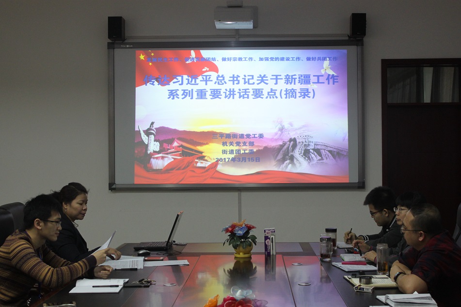 (通讯员:张春霞 陈荣良 )2017年3月15日,三平路街道党工委、机关党支部组织党员、入党积极分子、写入党申请书人员15人,学习习近平总书记关于新疆工作系列重要讲话要点。支部书记张春霞要求大家要原原本本、认认真真地学习习近平总书记系列重要讲话精神,全面理解中央决策部署,把学习所得融会到实际工作中,真抓实干推进各项工作取得实效。