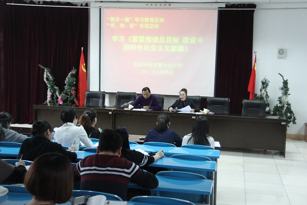 为严格落实学校“学讲话、转作风、促落实”专项活动方案,认真学习习近平总书记在“两会”期间参加新疆代表团审议会议时的重要讲话,感受总书记对全疆各族人民的深切关怀。2017年3月20日下午,克拉玛依市第十九小学召开全体教职工会议,认真学习《习近平总书记参加新疆代表团审议侧记》、《新疆日报社论:亲切的关怀 巨大的鼓舞》、《新疆日报关于习近平总书记参加新疆代表团审议的三个评论》等《白碱滩区思想理论宣传教育工作提示》(第六期)内容。