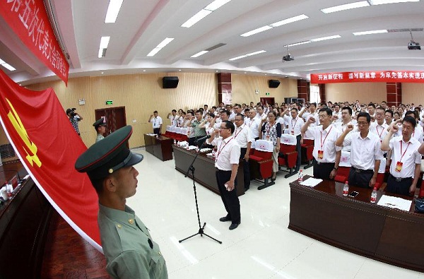 (中国共产党克拉玛依区第五次代表大会预备会议上,区委书记王军作为领誓人,带领全体与会代表重温入党誓词)